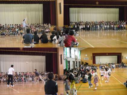 まずは,1年生が6年生に連れられて入場です。名前を呼ばれると大きな声で返事ができました。次に,全校で校歌を歌いました。1年生も元気に歌いました。そして○×クイズです。松陽小学校に関係するクイズが次々と出されました。その中で,得意のマジックやバレーボールを披露してくださった先生もおられました。最後に,1年生からのお礼の言葉と歌です。元気いっぱいで,かわいかったです。