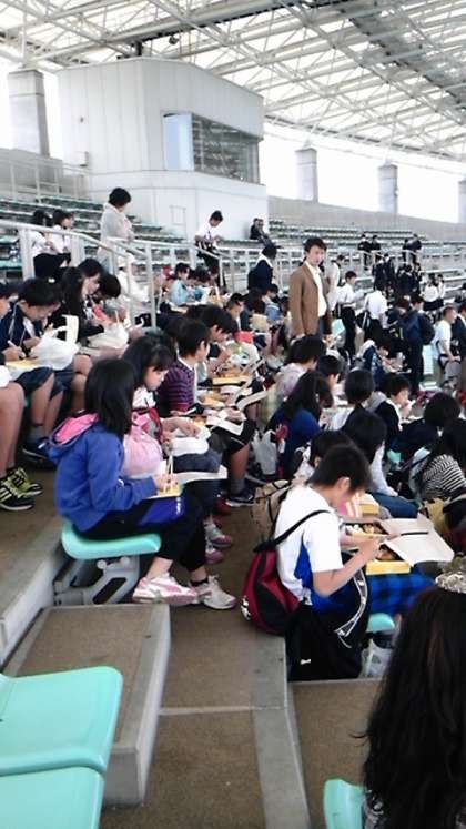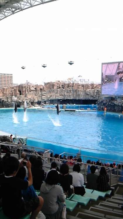 大晴天のなか名古屋港水族館に到着しました。さっそく大迫力のイルカショーを見ました。そして,お弁当を食べています。