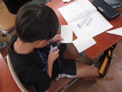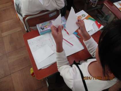 これまでに辺の数や頂点の数などの三角形や四角形の特徴を学習してきました。今日は、四角形を頂点と頂点を結んだ直線で切ってみたり、辺と辺を結んだ直線で切ってみたりしてできる形を調べました。