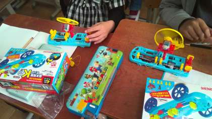 モーターをもっと速く回すには電池を増やすとよいという予想から,今日は直列つなぎと並列つなぎを学びました。二つを比べると,「直列つなぎの方が速い!」という子もいれば,「二つにそれほど差がない気がする」という子もいました。はっきりと違いを見つけるために次の時間は検流計を使って調べることになりました。