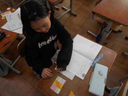 算数の学習で長方形、正方形、直角三角形を使ってオリジナルの模様を作りました。