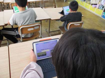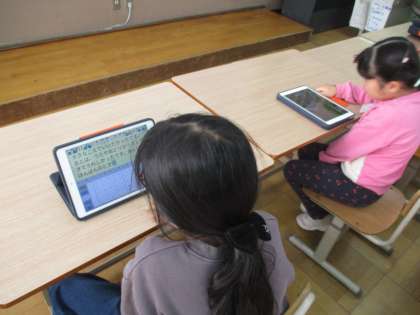 学習発表会の発表の動画をみんなで観てからタブレットで振り返りを書きました。
