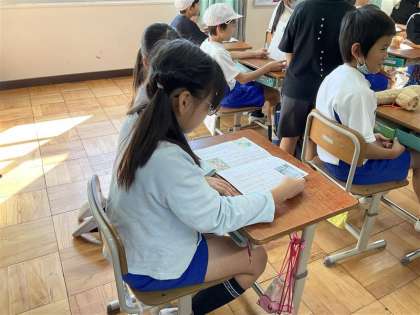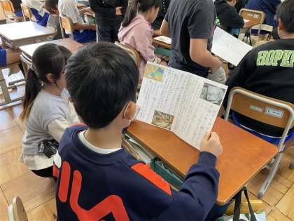 4年生の皆さんが、国語の学習で作った伝統工芸品についてのリーフレットを見せにきてくれました。リーフレットを読み、様々な地域の伝統工芸品について知ることができました。「どんな風に作られるのかよく分かったよ」「甲州水晶貴石細工というものを初めて知ったよ」など、5年生から4年生へ感想を伝えていました。