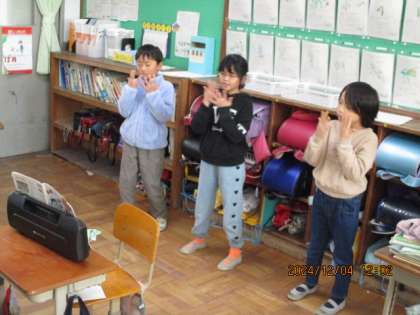 グループごとに『あのね、のねずみは』という曲の歌詞や音楽に合わせて振り付けを考えながら歌っています。最初は、恥ずかしそうだった子どもたちですが、今ではノリノリです!!