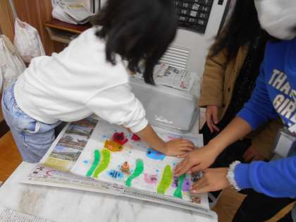 図画工作科で「紙版画」の製作に取り組みました。色インク紙の特性を生かしてカラフルなな世界を表現しました。蝶や、花や、魚などきれいでカラフルな作品が次々と刷り上がっていきました。