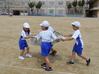 クラスごとに列に並ぶ練習をしたり、4人1組で新聞紙の上にボールをのせて運ぶゲームをしたりして楽しみました。