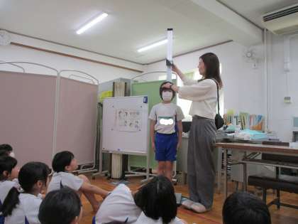 2年生になって初めての身体計測です。養護教諭の加藤先生から保健室の使い方などのお話を聞いた後、身長と体重を計測しました。