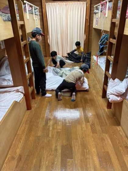 昨日は、ぐっすり寝ました。元気に過ごしています。7時の合同の集いに向けて、部屋をキレイにしています。来た時よりも美しく。頑張りましょう。