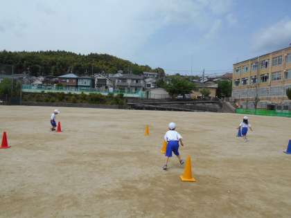 「かけっこあそび」では、ジグザクリレーをしました。チームのみんなの応援を受けて、一生懸命走りました。