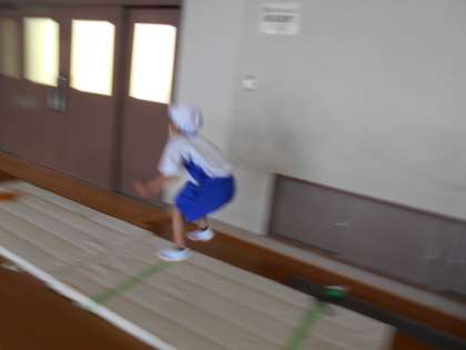 「立ち幅跳び」では、腺から出ないように、手を振って勢いをつけて跳びました。大ジャンプが出るたび、歓声が起こりました!