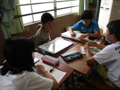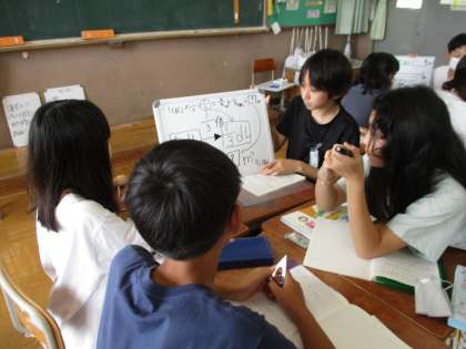 ホワイトボードに図をかき、図を使って説明し合いました。