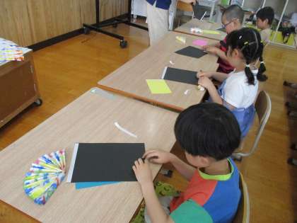 前回染めた、そめがみを使って、広がるお花や花火をつくりました。