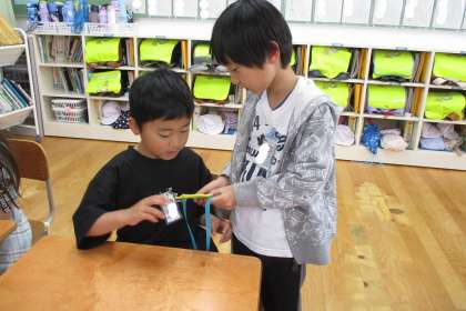 今、2年生は、1年生と仲よくなるために、いろいろなことに取り組んでいます。「1年生を迎える会」では、メダルを作り、1年生にプレゼントをしました。