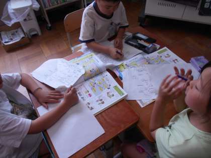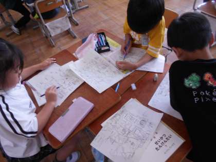 校区探検でどんなお店があったのかについて、地図や写真を見ながら、班で振り返りをしました。