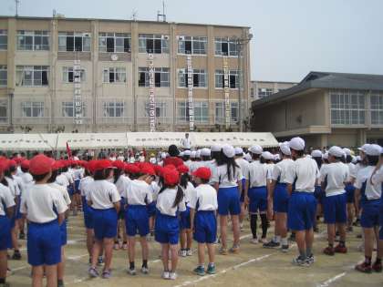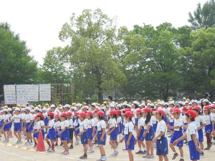 運動会が始まりました。入場,各色応援団のスローガン,可愛い1年生の誓いの言葉と進んでいきました。松陽体操も終わりました。