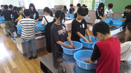 家庭科の学習で靴下の手洗いに挑戦しました。片方だけ手洗いをし、洗っていない方と比べました。汚れがが落ちて洗濯液が濁った人やにおいの違いに感動している人など手洗いの良さを実感していました。家でも挑戦してみてくださいね。