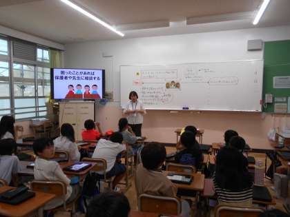 講師の先生をお招きして、スマートフォンを題材とした情報モラル教室を行いました。講師の先生の話をよく聞きながら、どのようにスマートフォンと関わっていくかについて真剣に考える姿を見ることができました。
