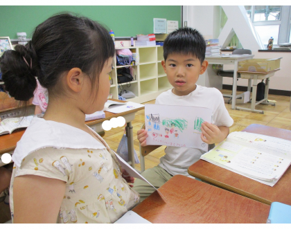 国語科『あったらいいな、こんなもの』で、思い浮かべたものを友だちに発表しました。友だちの絵を見たり、説明を聞いたりして、友だちの話を詳しく知るために、質問をしていました。