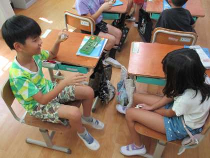 ペアで繰上がりのある足し算の問題を出し合って、答えはいくつになるのかを考えています。
