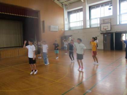 休み時間、体育館で大きな声ではりきって練習をしています。