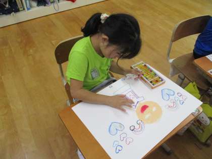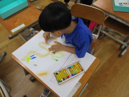 図画工作科の学習で、お話を聞いて想像した世界を絵に描いて表しています。