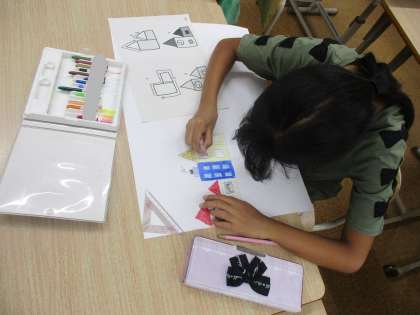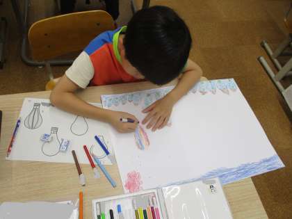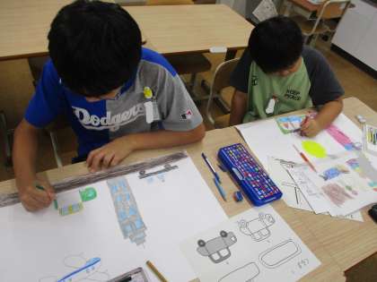 今日はこれまで学習してきた、絵を組み合わせて、じぶんのまちを描きました。