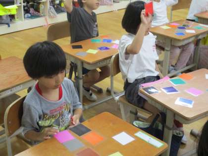 英語を聞いて、聞こえてきた色のカードを選ぶ活動をしています。