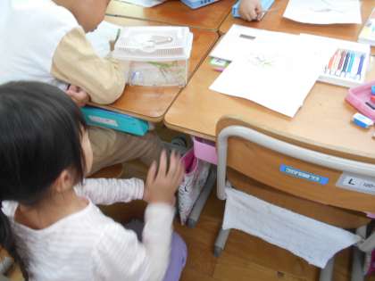 学校に戻ってから、見つけた生き物を観察しました。