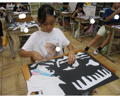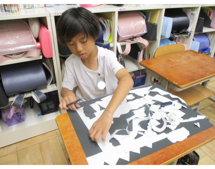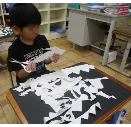 図画工作科『はさみのアート』では、切った形からどんなものに見えるかを思い浮かべて活動しました。