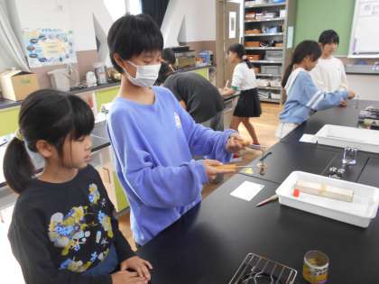 4年生の理科では「ものの温度と体積」の学習に取り組んでいます。本日は、鉄を熱すると体積がどのように変化するかを実験で確かめました。熱する前は輪を通っていた鉄球が、熱した後に通らなくなったとき、子どもたちから驚きの声があがっていました。