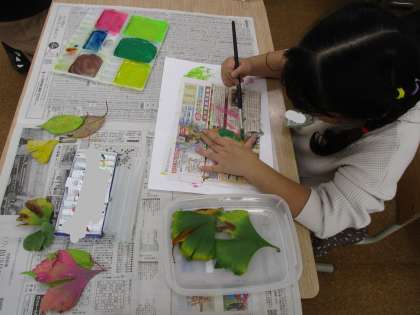 自然広場で拾った葉っぱを使ってアート作品を作っていきます。