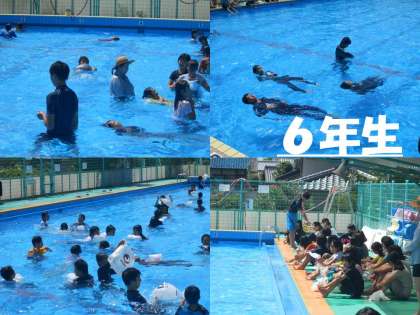 今日は,体育での水泳学習の最終日です。最終日は5・6年生の着衣水泳を行いました。服を着たまま,水中で体を動かします。水着ではない普段着を着ての水泳に子どもたちは戸惑っていました。「思うように体が動かない。」「服が水を吸ってとっても重い。」という声が聞こえてきます。しかし,水での事故に備えて子どもも先生も真剣です。ビニール袋や,プールサイドにいる友だちから投げ込んでもらったペットボトルをいかにうまく利用して浮くかを練習しました。また,ペットボトルを首の後ろやおなかの上に置いたり,あるいは抱えたりしながら泳ぐ練習もしました。