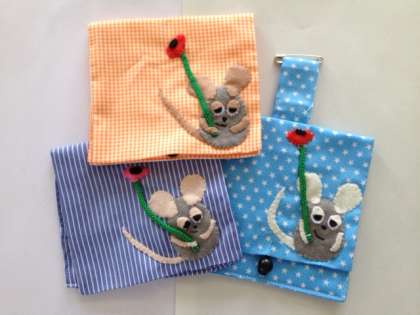 最近の洋服には,ポケットが付いていないものが多く,それでは不便だから・・ということで,ティッシュ・ハンカチ入れを作りました。本当に可愛く,便利な袋なので,これを付けると学校生活がぐ〜んと楽しくなります。アップリケは「絵本をたのしむ会」らしくレオ・レオニ「アレクサンダとぜんまいねずみ」から。
