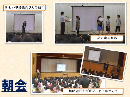 今日の朝会は,新しい事務職員さんの紹介・よい歯の表彰・松陽大好きプロジェクトについて6年生からの提案でした。