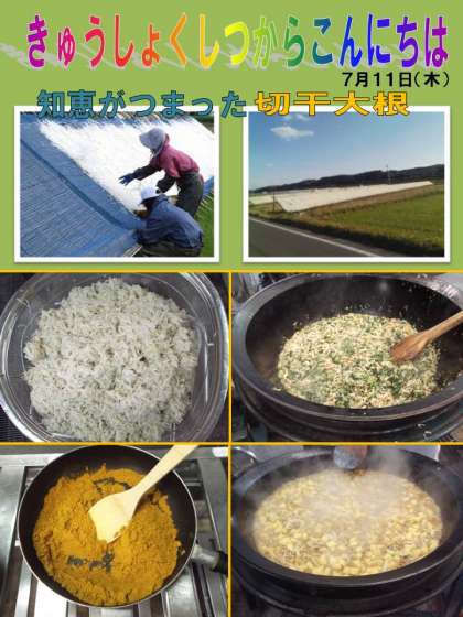 切干大根は,やわらかくもどしてからたきますが,甘味や風味がなくなるので,もどしすぎないように気をつけました。けずりぶしのだしで,ゆっくり煮含めましたよ。切干大根の生産量は,4人の給食調理員さんの中の1人が生まれた宮崎県が日本一ですよ。