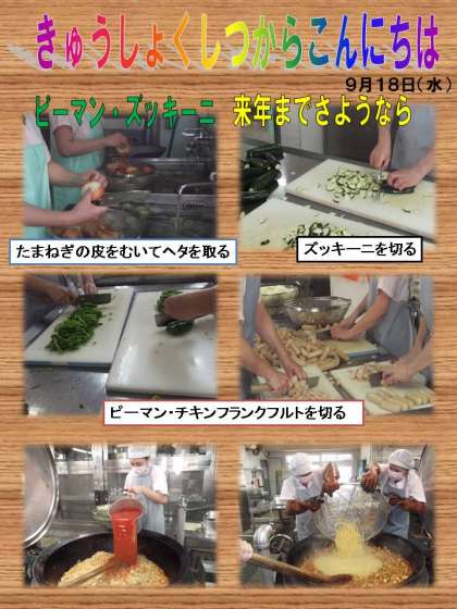 ズッキーニはトマトやオリーブオイルとよく合う野菜です。細長くて緑色できゅうりのように見えますが,かぼちゃの仲間です。9月は夏野菜がたくさん出てくるけれど,ピーマンとズッキーニが出るのは今日が最後ですよ。小松菜のソティは,緑・赤・黄色がきれいです。目でも味わいましょう。