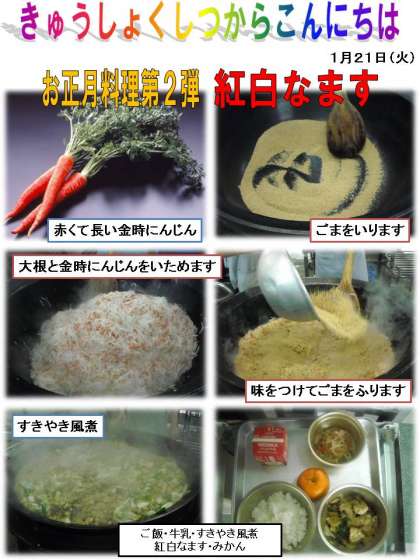 「紅白なます」は,金時にんじんと大根をせん切りにして,さとう・しょうゆ・すで味をつけて,ごまをふったものです。給食では野菜を生のまま出せないので,油で炒めましたが,できるだけシャキシャキとした歯ごたえが残るように仕上げました。甘い味・酸っぱい味・歯ごたえ・ごまの香り,たくさんのおいしさをみつけながら食べてください。