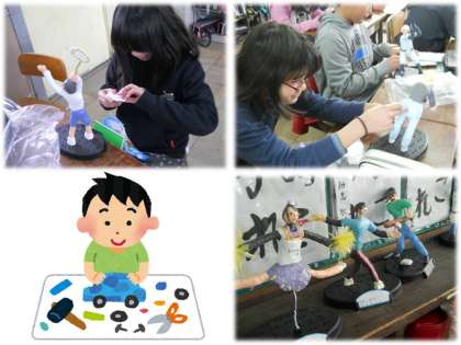 図工展の立体作品の仕上げの様子です。体の細かな動きに注意して,一生懸命に作りました。図工展に展示しますので,楽しみにしてください!