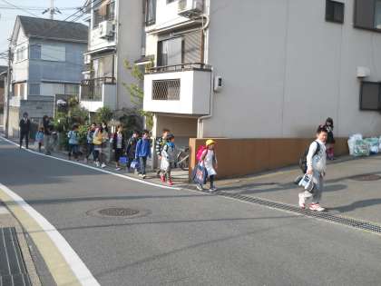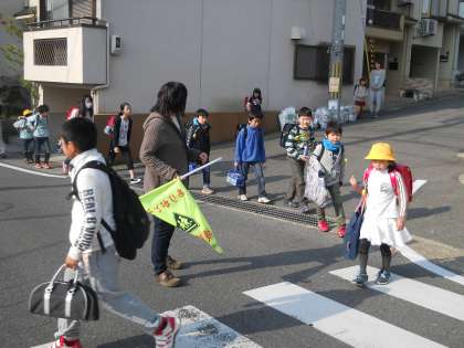 朝の登校の様子です。交通量の多い横断歩道には,いつもPTAの旗当番の方が立って安全に登校できるようにしてくださっています。子どもたちは,安心して登校することができています。いつもありがとうございます。