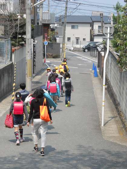 町別集会のあとは,集団下校です。地域委員の方や担当の先生も一緒に,危険な場所の確認などもしました。