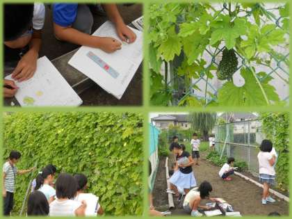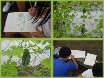 ツルレイシの花や葉,実の観察をしました。それぞれの形や色をしっかり見て,かきました。大きな実にはみんなも驚いていました。