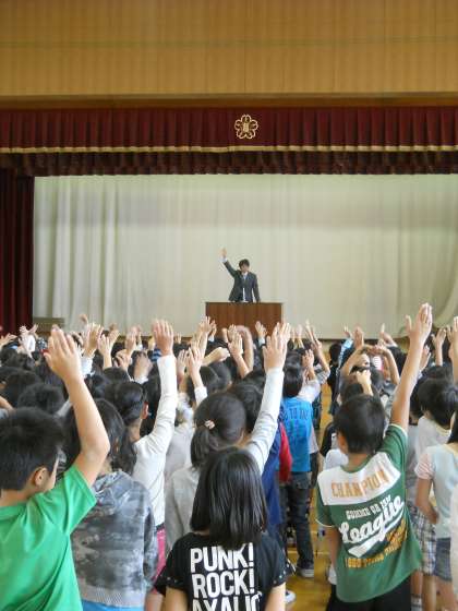 今日は前期最終日です。前期の終業式がありました。校長先生からのお話で,みんなは学校の目標に向けてがんばれたかをふり返りました。みんな笑顔で手を挙げて,がんばったことを確認していました。