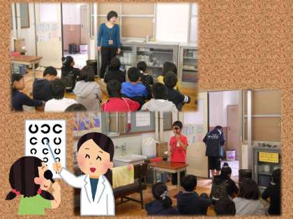 保健行事として【視力検査】を行っています。まずは左目を隠して…。次に右目を隠して…。しっかりと見えているかを調べます。検査の結果,プリントを持ち帰る児童もいます。眼科の受診を必要に応じて受け,学習の環境を整えてあげてくださるとうれしいです。