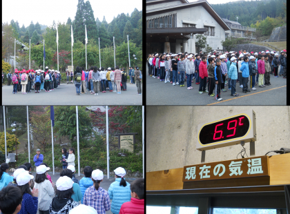 おはようございます。2日目の朝を迎えました。天気も良くとてもすがすがしい朝ですが、気温は6度、かなり寒いです。そんな中、合同宿泊校の広沢小学校と一緒に朝の集いを行いました。代表の子が松陽小の学校紹介を見事に行ってくれました。