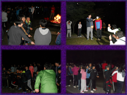 いよいよ最後の夜、お楽しみのキャンプファイヤーです。レクレーション係の楽しい進行のもと、大盛り上がりでプログラムは進みました。歌にゲームにフォークダンス、サプライズで先生たちの出し物など…。肌寒さを忘れるぐらいみんなで歌い、笑い、踊りました。