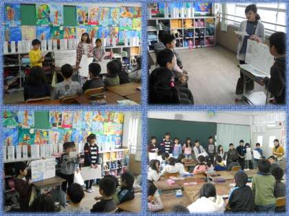 4年生が【環境】について学習したことをまとめ,3年生に発表しに来てくれました。『熱帯雨林について』『津波について』など,環境問題についていろいろと教えてくれました。3年生にとっては知らないこともいっぱいで,真剣に聞き入っていました。4年生のみなさん,ありがとうございました。