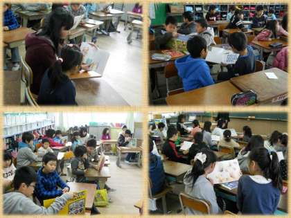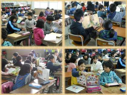 読み聞かせに行く学年は,この日のために前もって本を選んだり読む練習をしたりしていました。高学年の子どもたちは工夫しながら読んでいました。おにいさんやおねえさんに読んでもらって,1・2・3年生はみんな,本の世界にひきこまれていました。“やさしさ”が届けられました。