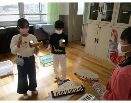 音楽科『リズムをかさねて楽しもう』では、2拍子や3拍子のリズムに合わせて、楽しみました。
