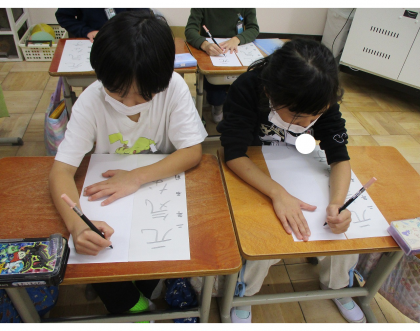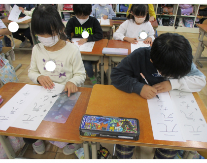 書写では、書き初め『元気な子』を書きました。文字の形や中心に気をつけることをめあてにして、お手本をよく見て、書きました。文字を大きく書くことが、難しかったようですが、練習を重ねて書き上げることが、できました。