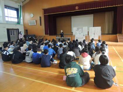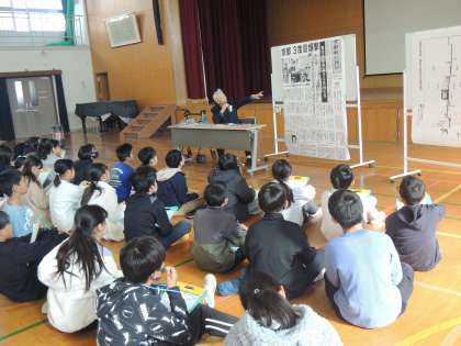 総合の平和学習では、戦争を実際に経験された方に来ていただき、当時の様子や思いなどお話を聞かせていただきました。京都の西陣地区に投下された爆弾によって被害を受けたお話や今を生きる子どもたちへのメッセージなど貴重なお話をしていただきました。